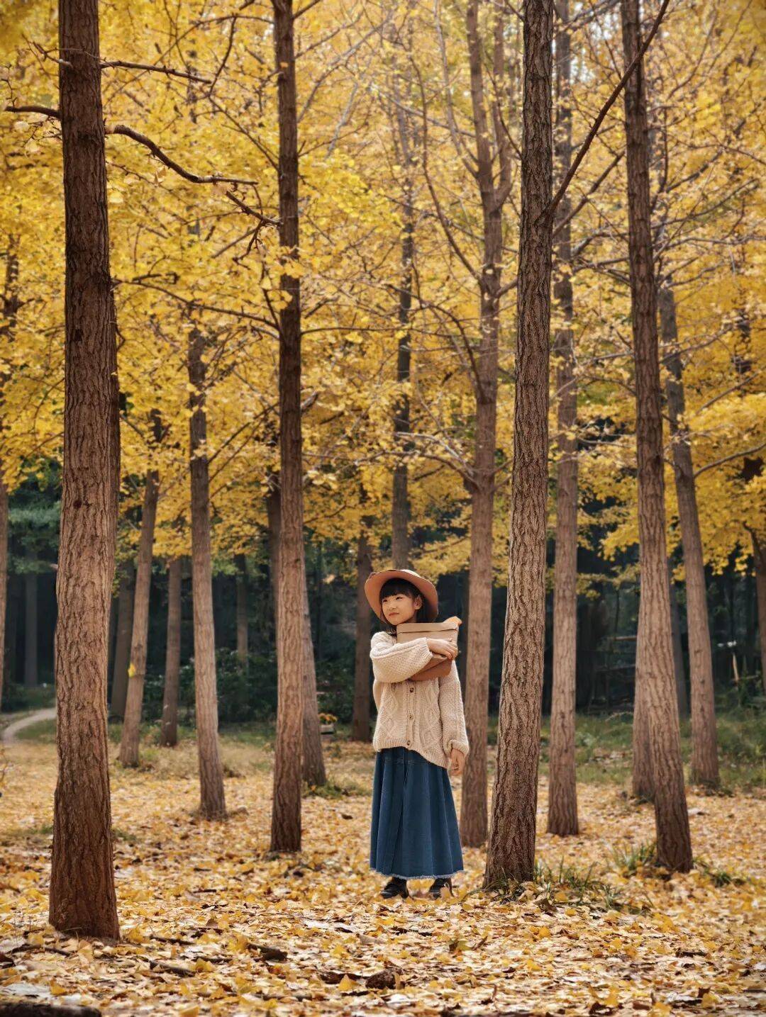 阳光穿过银杏叶地面铺满闪亮的光斑孩子脚下的“沙沙”声