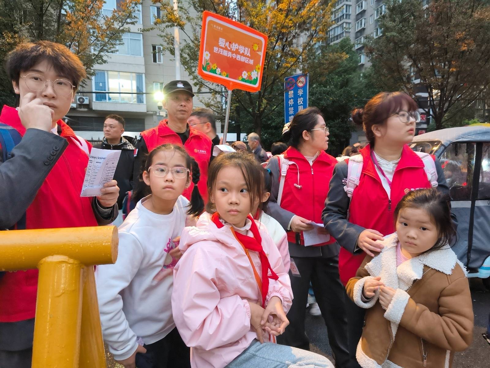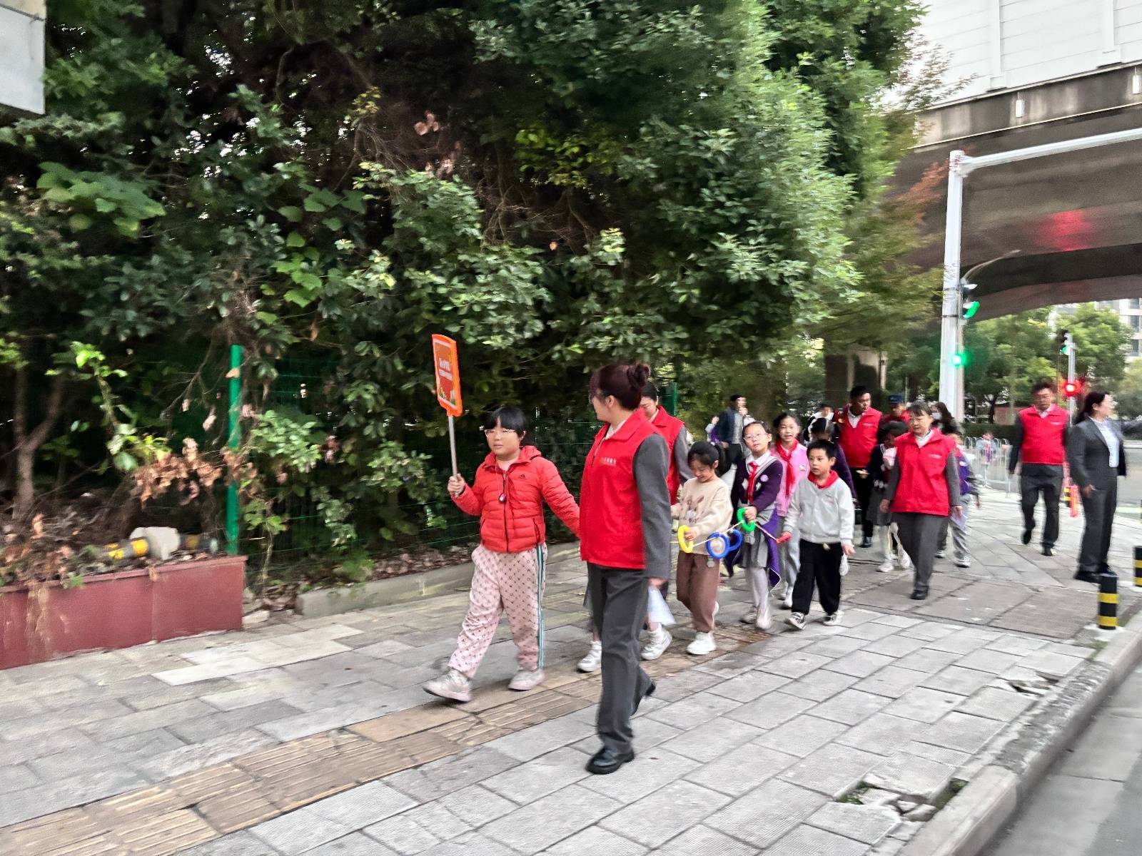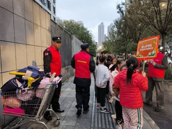 11月6日下午5点,两支护学队准时出发。一至三年级队伍由6名工作人员组成,分工明确:有人负责校门口接应,有人指挥交通,有人维持队列秩序。物业专门采购了带有轮子的手推车,用于集中运输书包。